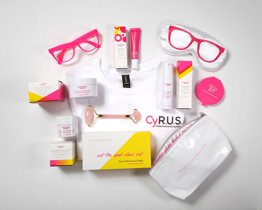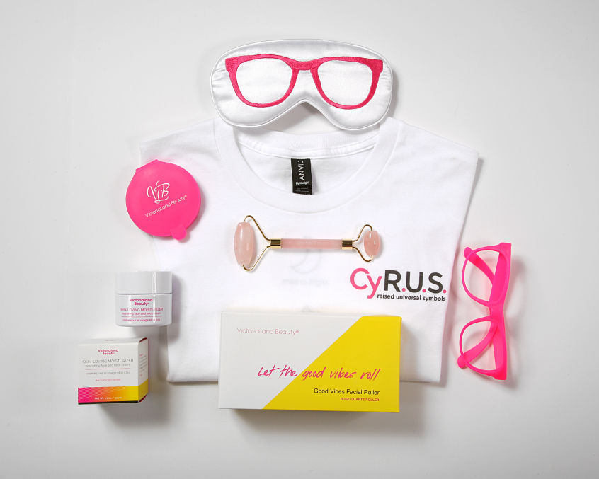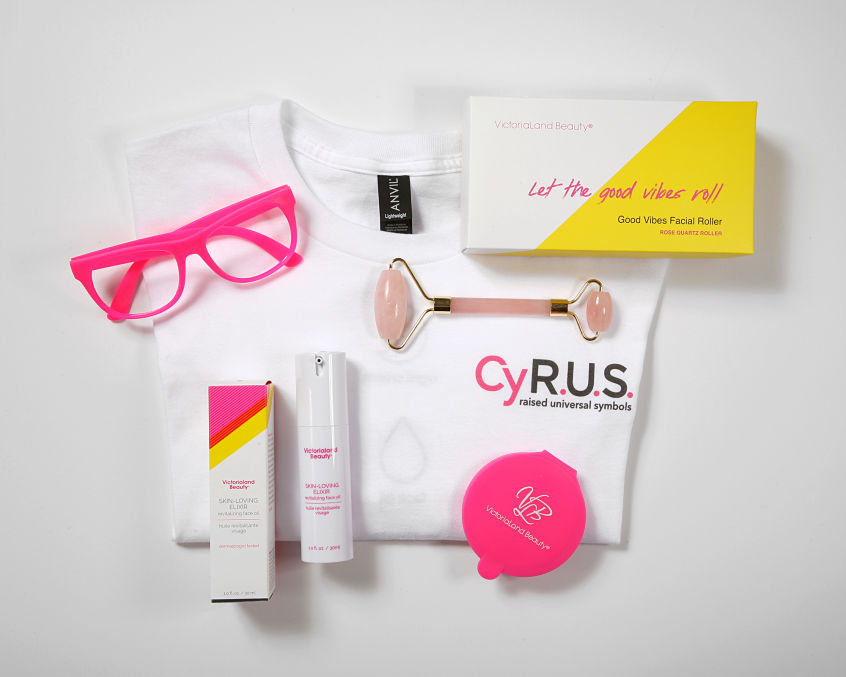 Full Size Elixir, Full Size Face/Neck Cream, Rose Quartz Roller, Silk Eye Mask, Pink Glasses, T-Shirt, Full Size Sleep Mask, Eye/Lip Treatment, Pink Compact