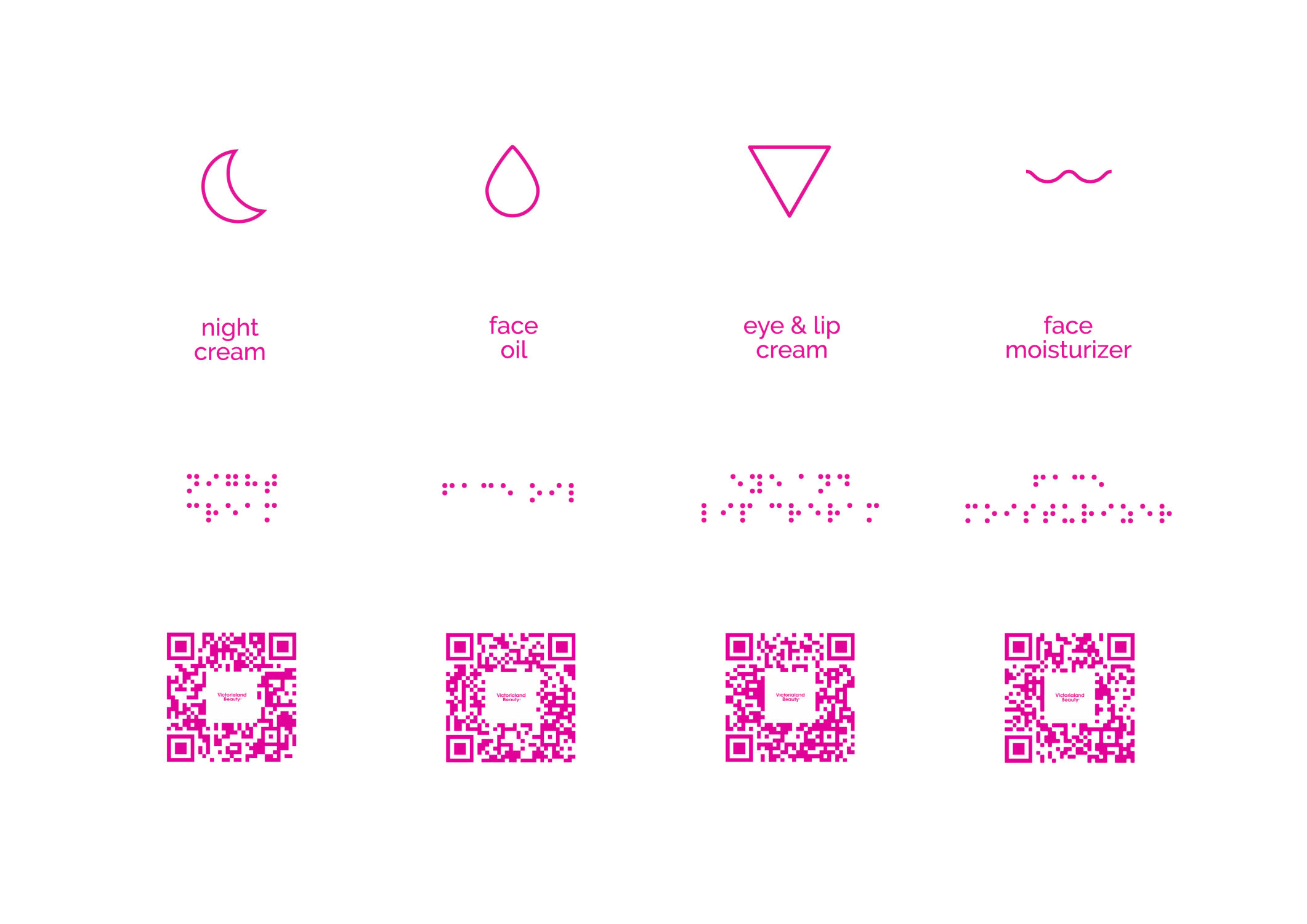 Heartened by the divine wonder of this eye-opening experience, The CyR.U.S. System of Raised Universal Symbols was created. This proprietary tactile recognition system is comprised of a universal set of raised symbols placed on each product’s primary package to facilitate identification. With a simple touch, VLBs’ skin-loving products are accessible to all!